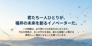 イベントの設計・準備・運営に尽力をされた福井県教育局、JTBの皆さん、出展をされた企業・大学の皆さん、そして生徒たちを伴走した学校間関係者の皆さん、そして何よりも主役である生徒たち皆で創りあげた結果。本当に素晴らしいイベントに関わらせていただいたことに心から感謝の気持ちでいっぱい。