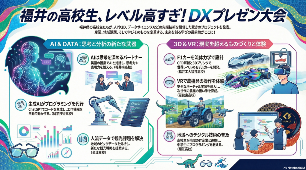 このたび、弊社代表の西條康介が福井県教育庁主催のDXハイスクールアカデミーにて、基調講演の機会を頂きましたので、その概要について記載します(上記は生成AIが作成したポスター)。