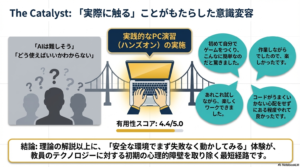 テーマは「生成AIで変わる授業と探究活動」ということで、生成AIを単なる「答えを出すための道具」としてではなく、生徒たちが自立的に学び、自らの思考を深めていくための「パートナー」として活用できる指導法の習得を目的としました。